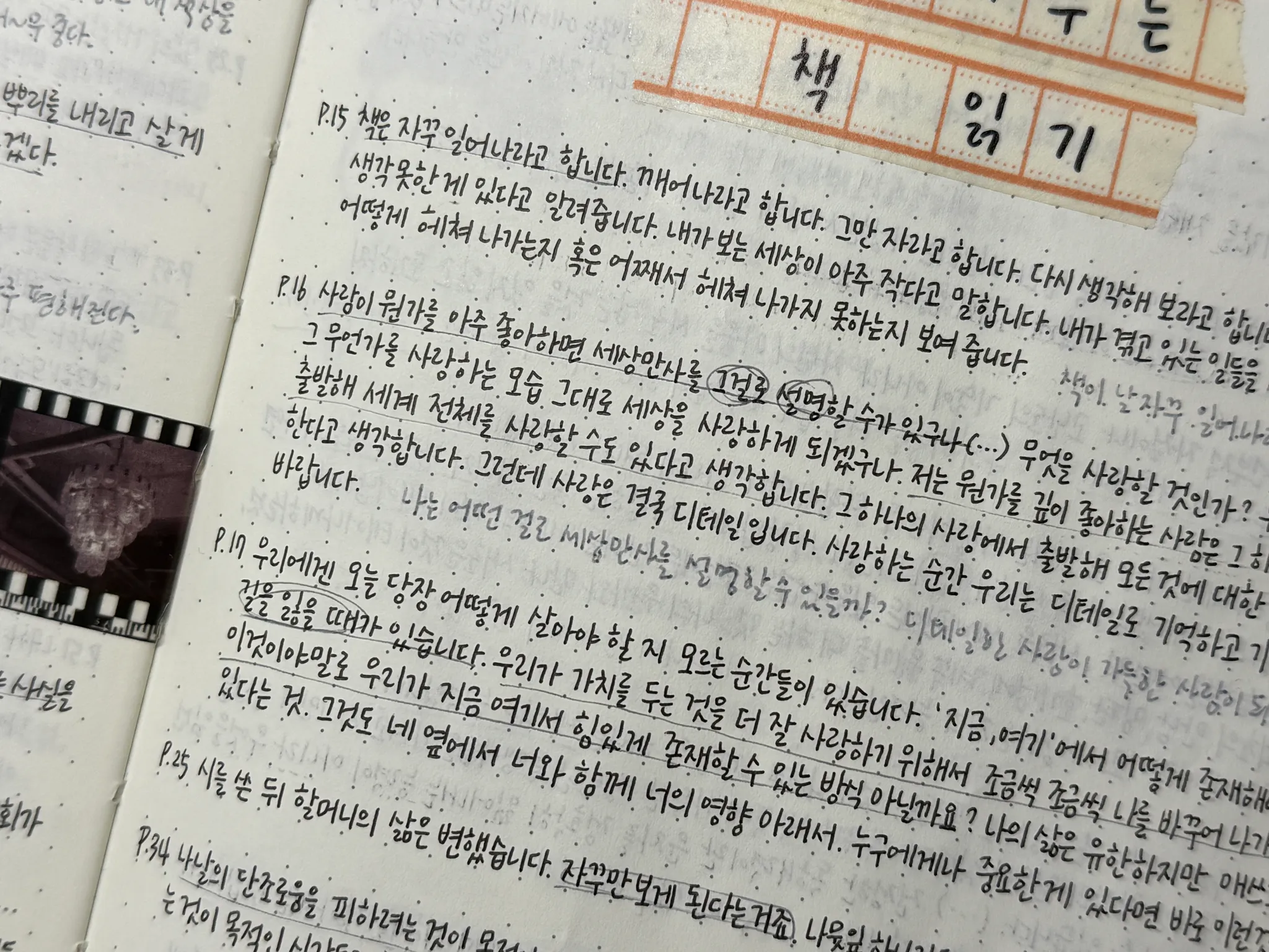 좋은 문장을 베껴 쓰는 일은 나의 생각을 움트게 했습니다. 책을 펼치기만 하면 건강한 생각을 가진 인생 선배가 나타나 좋은 질문을 던져주었고, 저는 그 질문에 대한 답을 성실히 써 내려갔습니다. 필사 노트 속 수많은 인생 선배들이 제게 감동이라도 했는지, 이런 마음을 선물로 주더라고요.