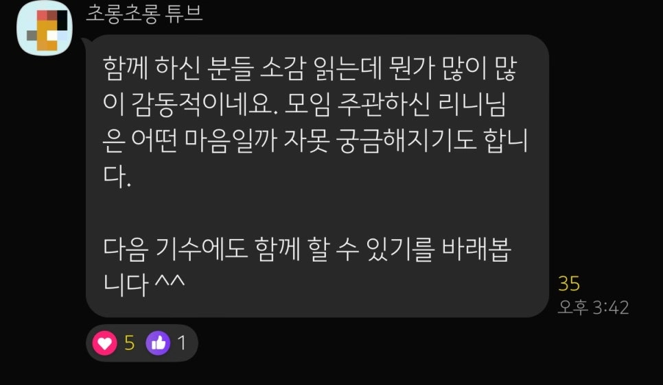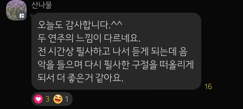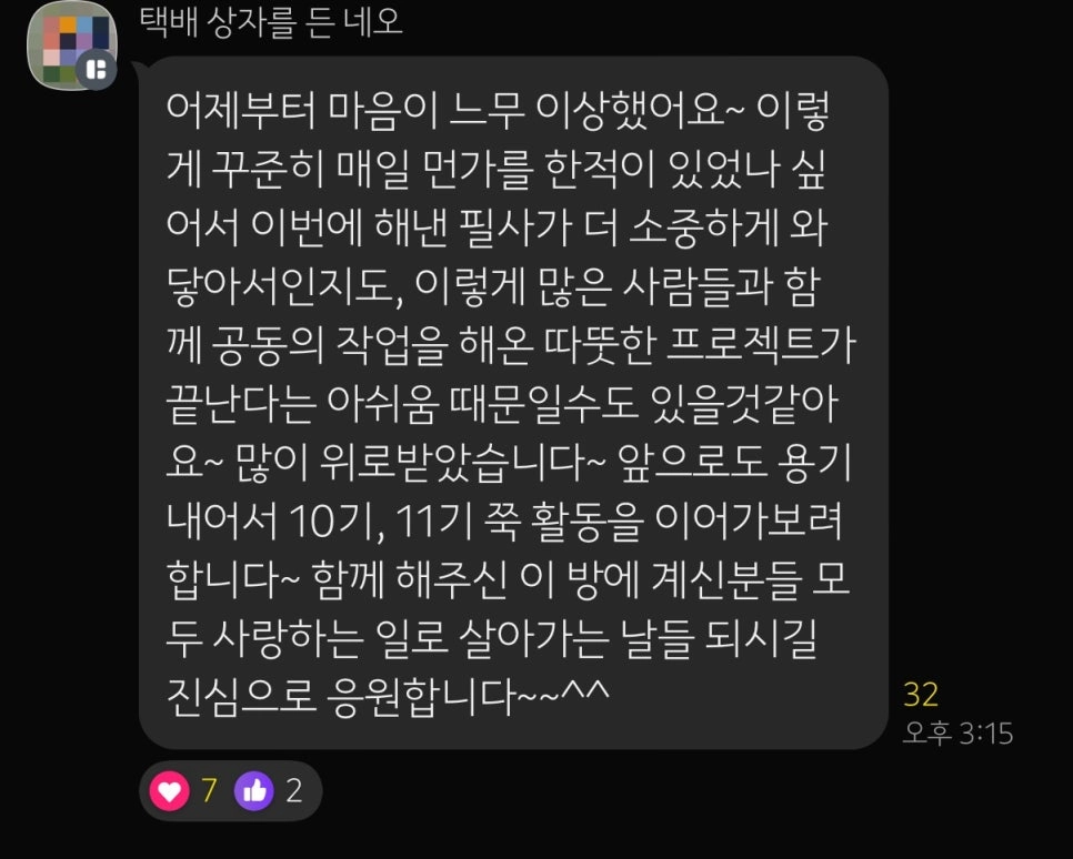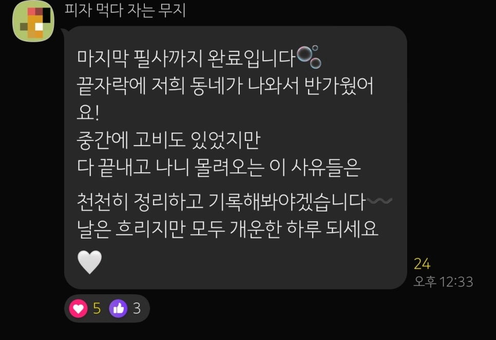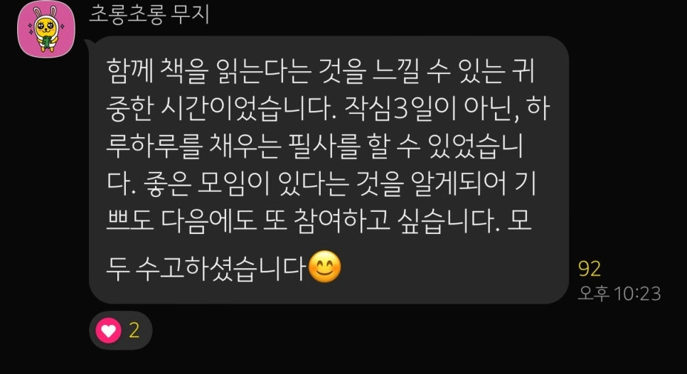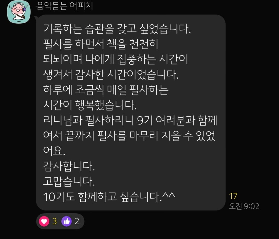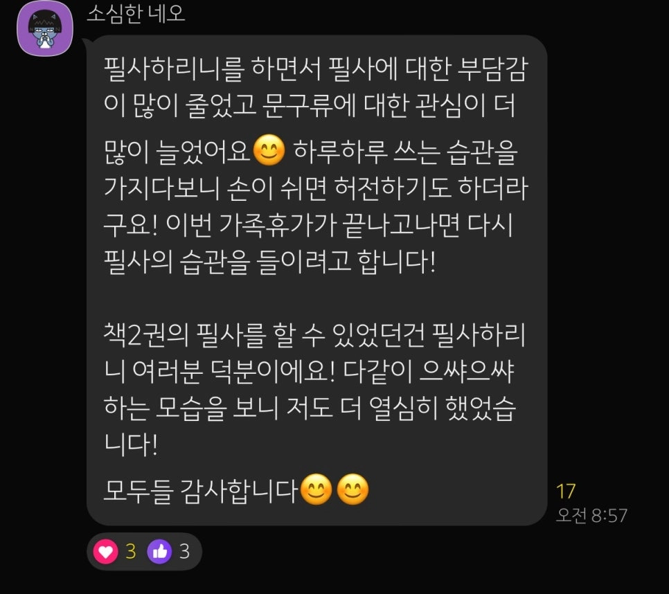 책2권의 필사를 할 수 있었던건 필사하리 니 여러분 덕분이에요! 다같이 으쌰으쌰 하는 모습을 보니 저도 더 열심히 했었습 니다! 모두들 감사합니다