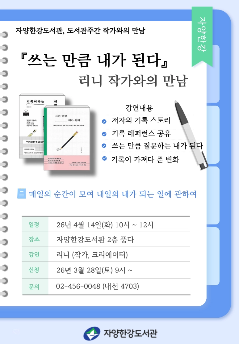 [행사 안내] 자양한강도서관 작가와의 만남 : 기록친구 리니 강연